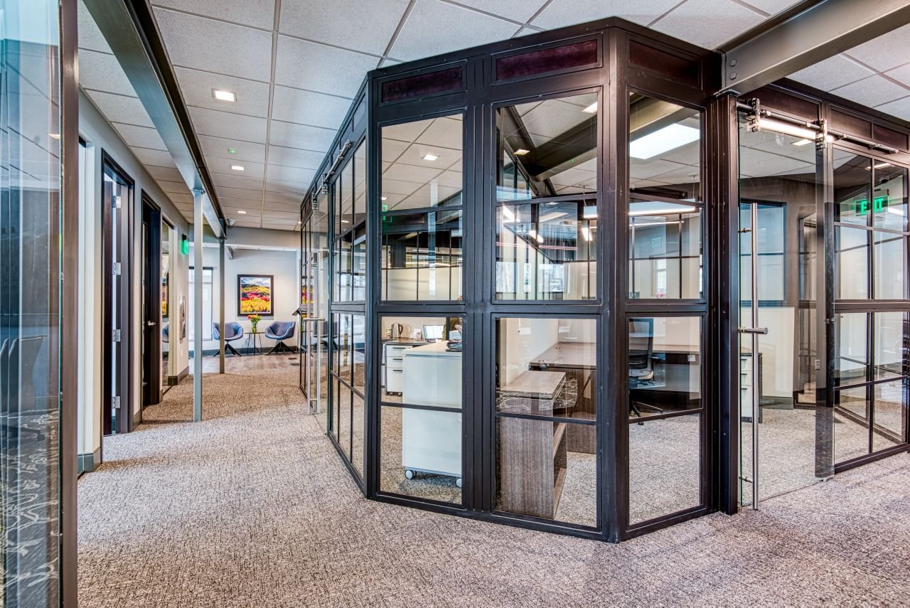 Renovation of an existing office building in the historic district downtown Golden, Colorado. The exterior improvements included the update the finish materials to eliminate the building’s low, bunker-like feel with features like the entry skylight and uplifted exposed timber structure. The interior included the demolition of a dim maze of small exam and treatment rooms and addition of a sophisticated, open, and airy office design with high-end finishes with some industrial elements custom made in the Spectrum steel shop.